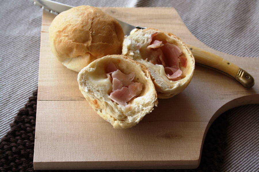 Questi con prosciutto cotto e formaggio all'interno sono davvero buonissimi e, diciamo, pronti per la merenda, basta scaldarli leggermente, anche al microonde (a 300 per 1-2 min).