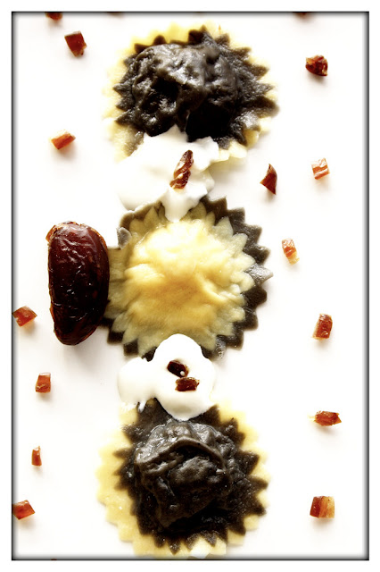 Servire i ravioli con la emulsione di burrata, ancora datteri tagliati a puntini e, se volete, un dattero che io ho mangiato alla fine, a modo di dolce :)