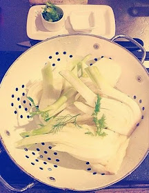 Intanto cuocete al vapore 1 sedano grande tagliato a fettine sottili e la parte bianca di mezzo porro tagliato a rondelle, in modo che si ammorbidiscano il più velocemente possibile. Una volta diventati teneri passate al mixer con due, tre rametti di finocchietto, formando una crema e aggiungete man mano il brodo di verdure filtrato e 50 ml di latte. Continuate a mixare sino ad ottenere una consistenza da vellutata.