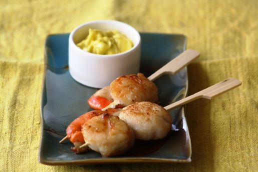 Io ho infilato le capesante negli spiedini in modo di poter attingere nella maionese pepata a modo d'aperitivo, anche consumato in piedi.