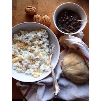 Mi sembra importante non unire in una sola preparazione i due ripieni ma lasciarli separati. Adagiando prima il ripieno di formaggi e noci e sopra quello di radicchio tardivo, una volta cotta la empanada, ogni morso risulta diverso, a tratti filante e affumicato per passare poi al sapore robusto e leggermente amaro del radicchio e ancora alla dolcezza della ricotta o la croccantezza di un pezzettino di noce.